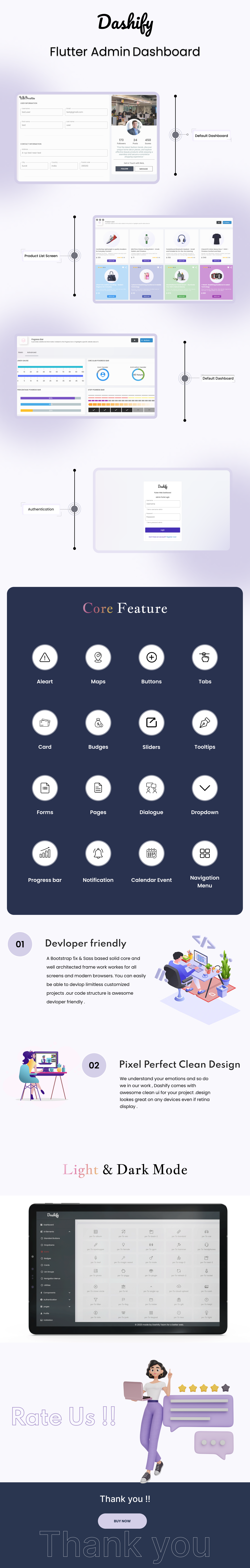 About: Buzz is a Flutter-based admin panel, dashboard, and web application template that can be used to build responsive and highly customizable applications. The template includes features such as a configurable dashboard with various widgets, user management, role-based access control, data tables, and charts.